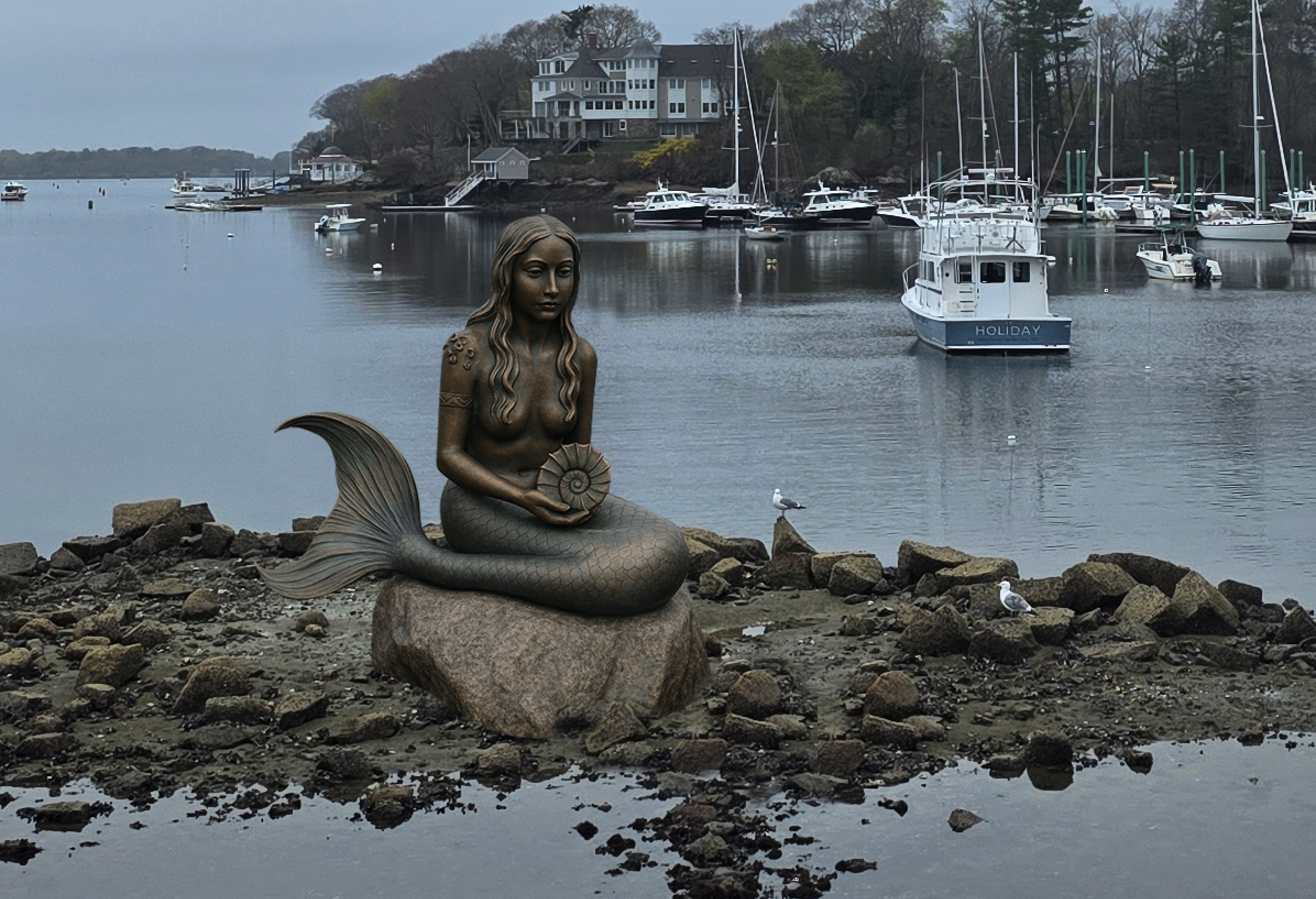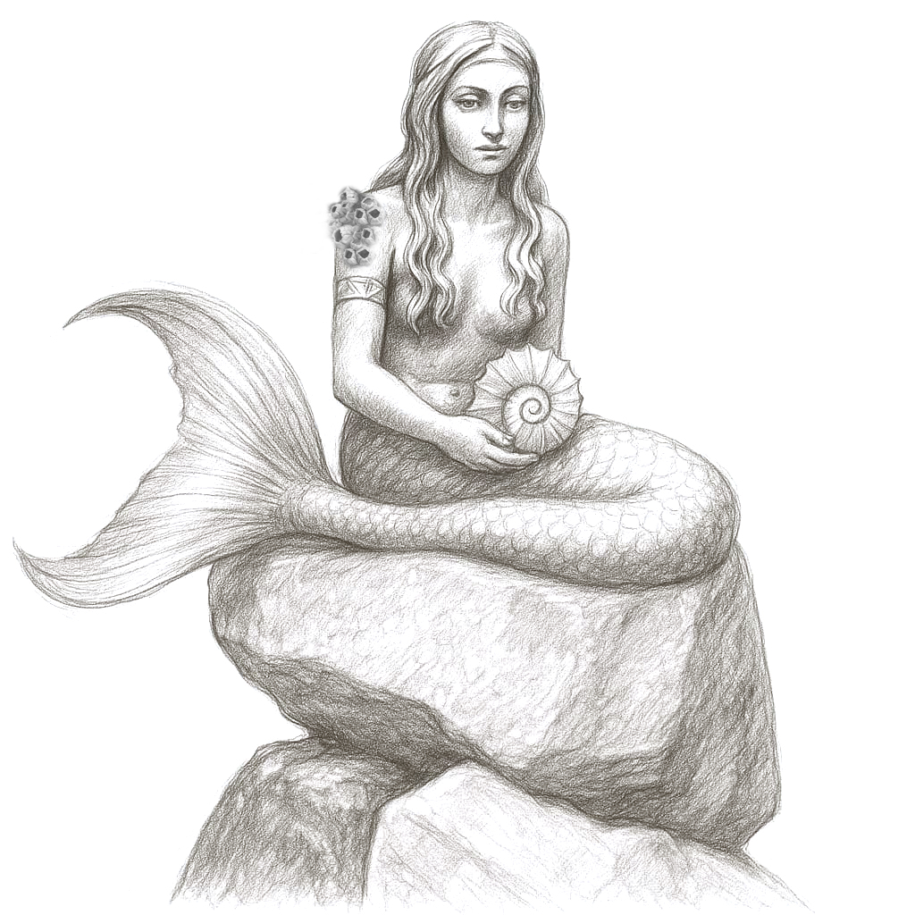 A mermaid, resting in stillness—covered by the high tide, revealed by the low.